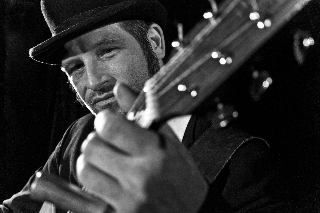 Schwarzer Anzug, Melone auf'm Kopf und 'ne Gitarre auf dem Schoß … Wer hätt's gedacht … Ein Bluesmann...